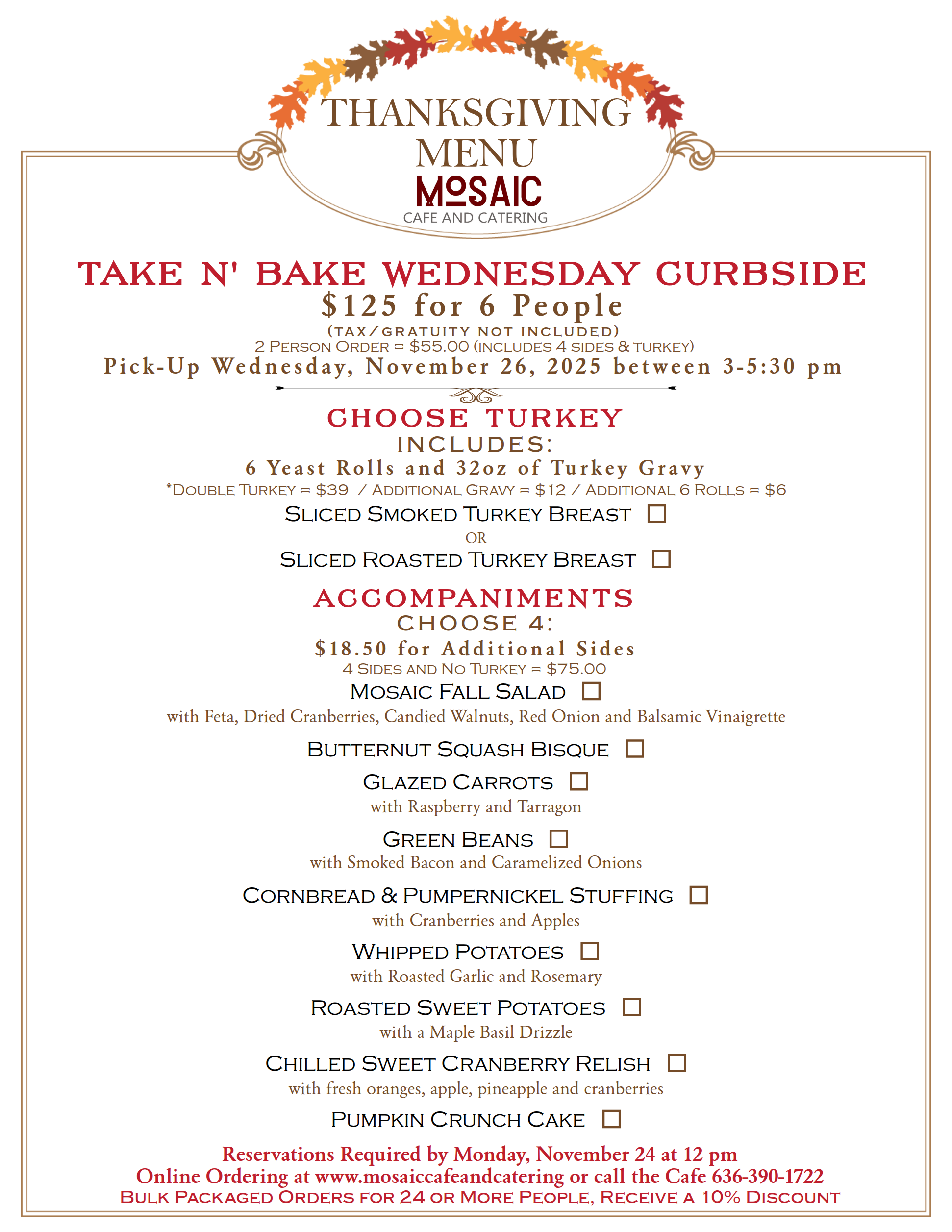 Contact: 636-390-1722 or email info@mosaiccafeandcatering.com to change an order or pickup time. All changes must be submitted by Monday, November 24th at noon.
